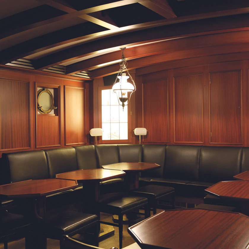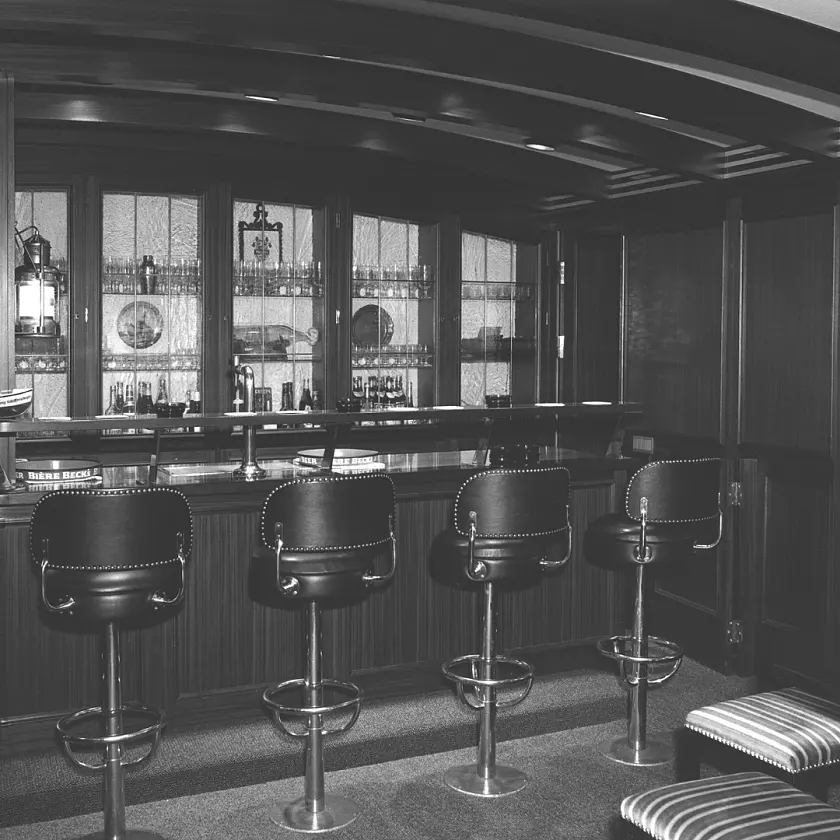 Nach einem Abstieg über eine lange Treppe ins Untergeschoss der Landesvertretung findet man sich vor einer unscheinbar anmutenden Tür wieder. Hinter dieser verbirgt sich ein originaler Nachbau einer urigen „Schiffs-Kajüte“, traditionell im Sinne der Hanse. Mit Betreten dieser Kajüte wird man im selben Augenblick in das Gefühl versetzt, mitten auf der Nordsee vor Bremerhaven vor Anker zu liegen. Der Geruch in der Kajüte erzählt von langen Abenden, tiefgründigen Gesprächen und so manchem Seemannsgarn. Einzig das Gefühl, dass sich die Kajüte in mitten eines Schiffes nicht bewegt bringt uns zurück in die Realität, dass wir uns in der Bremer Botschaft in Mitten von Berlin befinden.