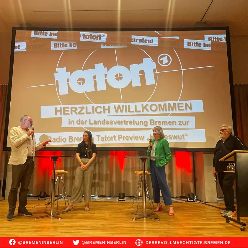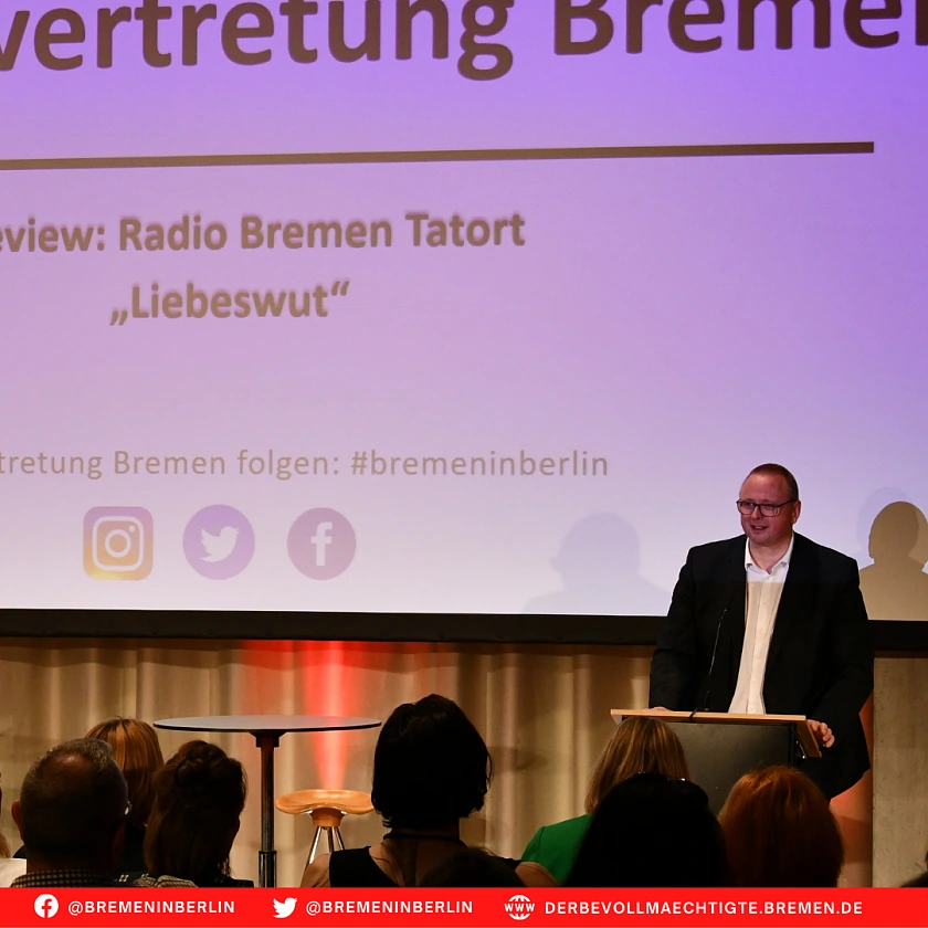 Nachdem im vergangenen Jahr Corona-bedingt auf eine digitale Preview des Bremen Tatorts zurückgegriffen werden musste, freute sich der Bevollmächtigte beim Bund und Staatsrat für Medien Dr. Olaf Joachim, am gestrigen (23. Mai 2022) Montag umso mehr, zusammen mit Radio Bremen rund 100 Gäste persönlich in der Landesvertretung Bremen begrüßen zu dürfen.