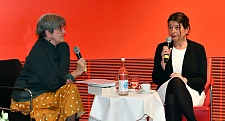 Im Anschluss begeisterte Radka Denemarková, mit ihrer Lesung und im Gespräch mit Libuse Cerná, der Leiterin des Festivals globale°. Libuse Cerna würdigte Radka Denemarková als eine der wichtigsten tschechischen Autorin der Gegenwart. In ihrem Buch „Ein Beitrag zur Geschichte der Freude“ verwebt sie Elemente des Kriminalromans, Fakten und Fiktion zu einem eindrücklichen Roman: Drei ältere Damen betreiben in Prag ein Archiv, das Gewalt gegen Frauen dokumentiert. Als er den Tod eines einflussreichen Unternehmers untersucht, stößt der namenlose Ermittler auf die Archivarinnen und ihre Sammlung.