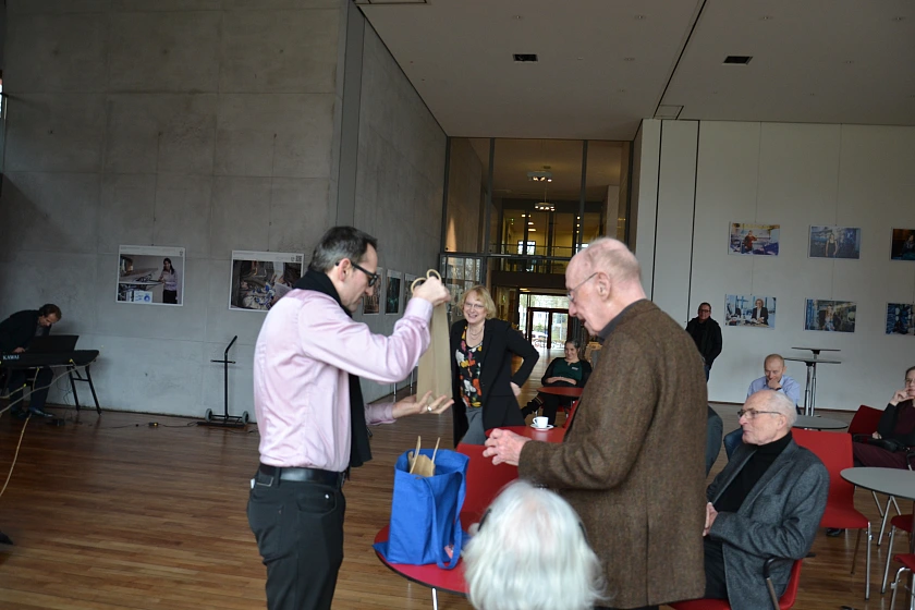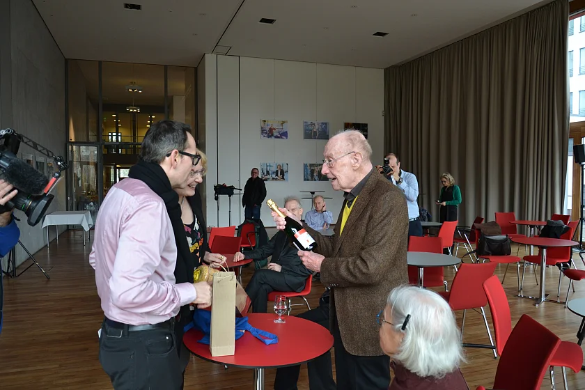 Als Dankeschön überreichten Bezirksbürgermeister von Dassel und Bezirksstadträtin Sabine Weiß dem Leiter der Landesvertretung Bremen beim Bund in Berlin zwei junge Ahornpflanzen. Dienststellenleiter Frank Hanf richtete sich in seinem Grußwort auch an Edzard Reuter: „Ihr Vater hatte so viel Hoffnung und Glauben an die Zukunft, dass er gesagt hat, wir forsten den Tiergarten wieder auf. Es ist eine Freude, dass Bremen dies in föderaler Solidarität unterstützen konnte. Wir werden sehr darauf achten, dass die Verbundenheit zwischen unseren beiden Stadtstaaten auch in Zukunft weiter wächst.“